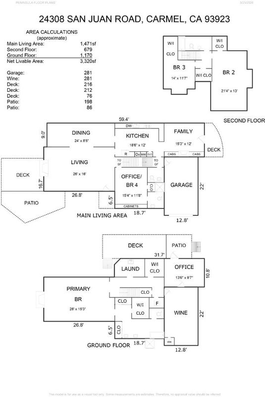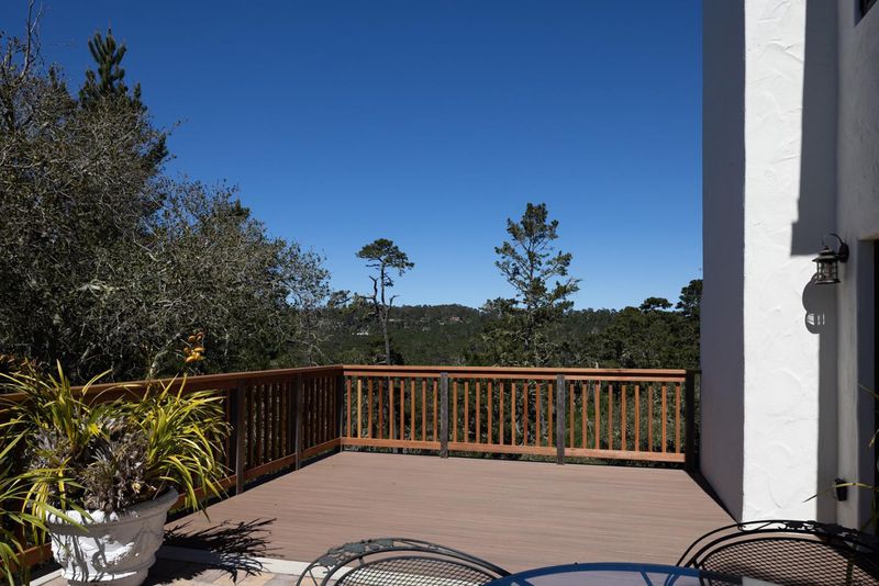 Tucked away in a peaceful pocket of Carmel Woods, this beautifully updated home sits above the forest canopy, offering expansive vistas and glimpses of the ocean from select rooms. Three newly built decks surround the home, providing multiple outdoor spaces to enjoy the forest views. Inside, the main level features a spacious living room with soaring open-beam ceilings, a fireplace, and rich hardwood floors that extend throughout. The dining area is lined with windows, inviting in natural light and ocean views. The well-appointed kitchen with marble countertops flows into a family room with its own fireplace and direct deck access. A versatile library with built-in shelving sits adjacent to a full bath, with flexibility to serve as a fourth bedroom or guest suite. Upstairs, two bedrooms with vaulted ceilings share a full bath. On the lower level, the expansive primary suite provides a private retreat with a fireplace, private patio, and a large bathroom featuring both a soaking tub and separate shower. Additional spaces include a dedicated office and a stone wine grotto. Located just minutes from downtown Carmel and the beach, this charming forest hideaway enjoys a quiet setting.