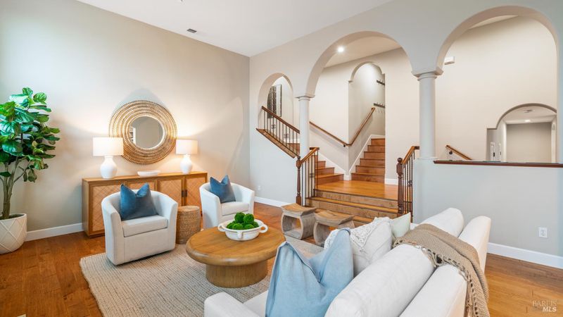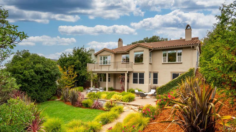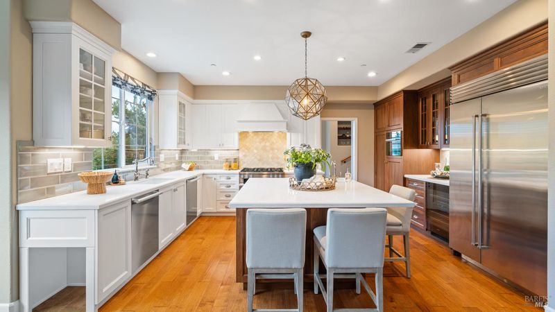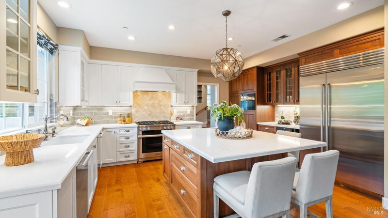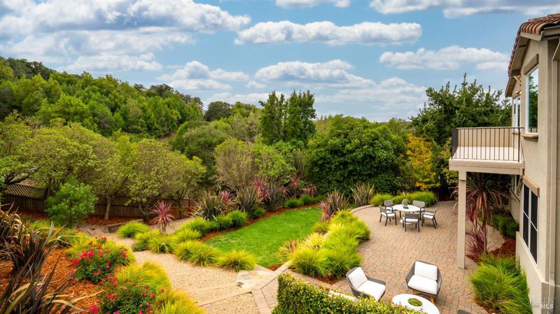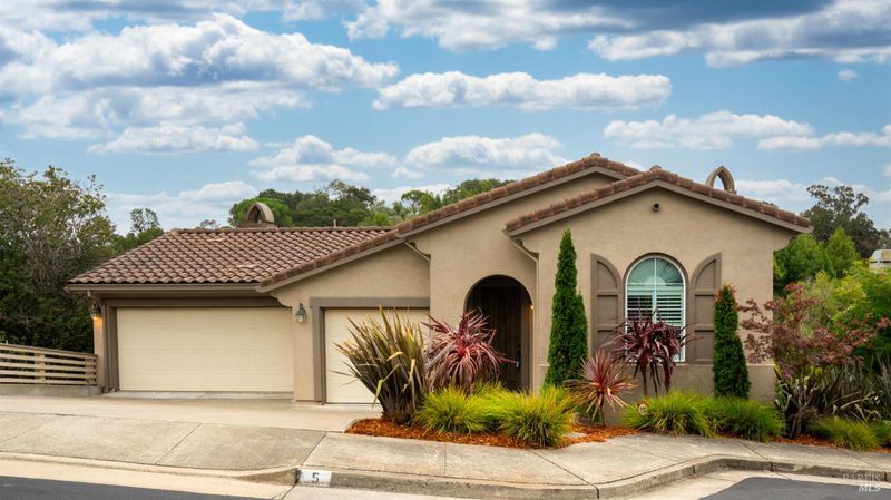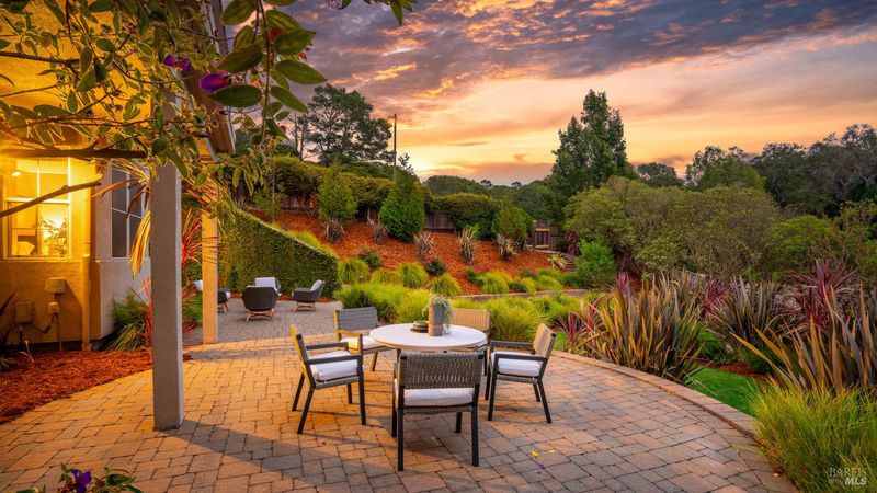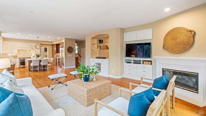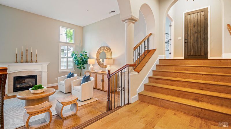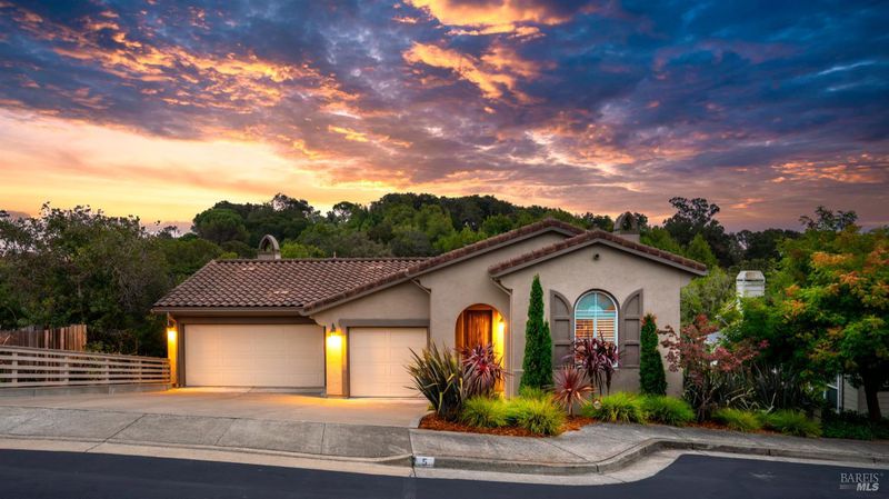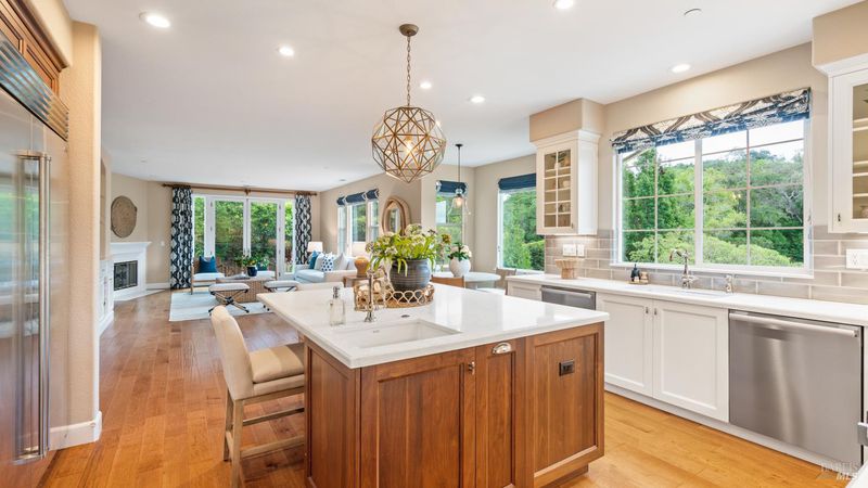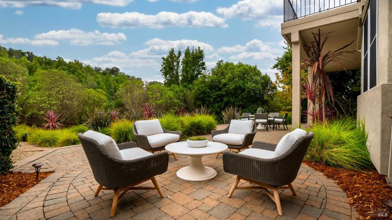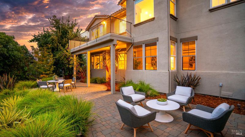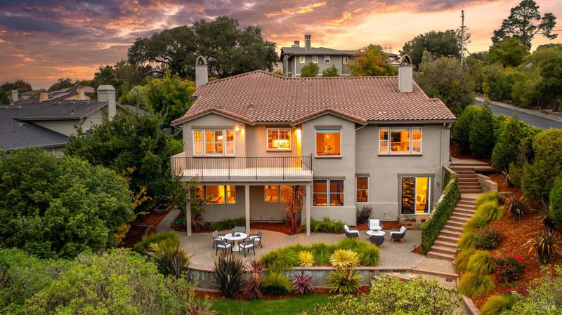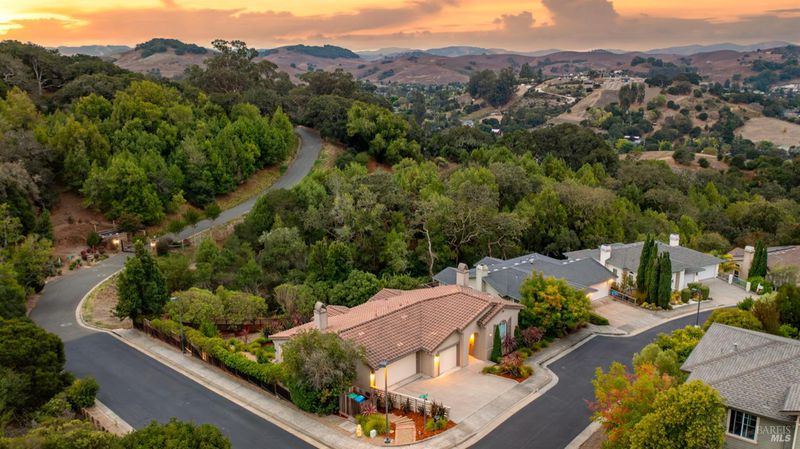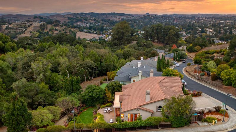 This Country Club Estates corner home exemplifies luxurious, comfortable living. The elegant front yard features tasteful low-maintenance landscaping leading to an ornate wood door. Inside, a spacious study impresses with tall ceilings and windows, glass French doors, and ceiling fan. Descend to the living room with a gas fireplace or continue to the dining area with chandelier and scenic views. The bright chef's kitchen offers quartz counters, a large sink island, Miele appliances including two dishwashers and a wine fridge, and soft-close cabinets. The open family room includes a gas fireplace, built-in shelves, backyard access, and a dining nook. This level also holds a deck, full bath, 3-car garage, and great storage. Downstairs are three guest rooms (one with backyard door), a full bath, laundry room, and luxurious primary suite with a soaking tub, spacious shower, illuminated double vanity, and expansive walk-in closet system. The lower area includes a family room with Bose speakers and a tiled room perfect for a personal gym. The backyard is quiet, private, and lush with brick patio, private walkway to the jetted hot tub, and hillside landscaping all backing to peaceful nature. All of this with included A/C and smart thermostats, you won't find more peak Petaluma living!