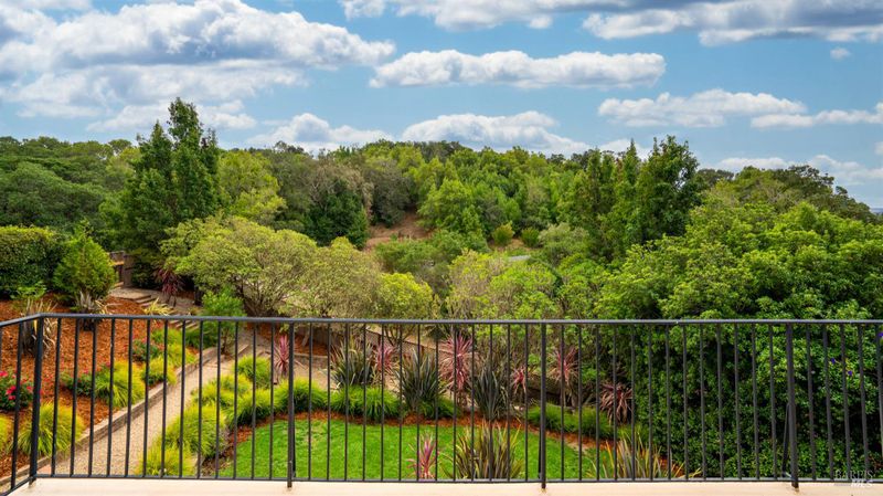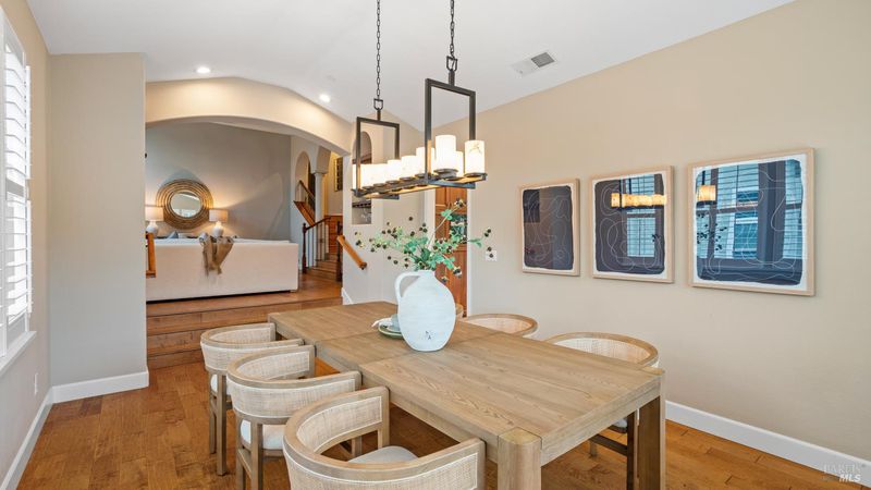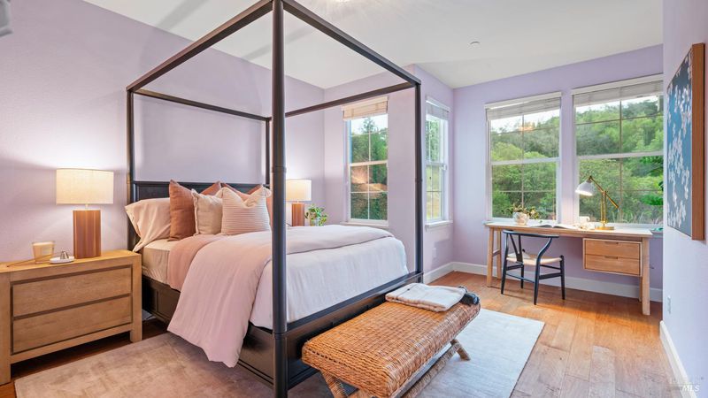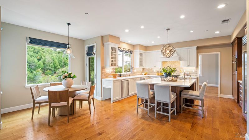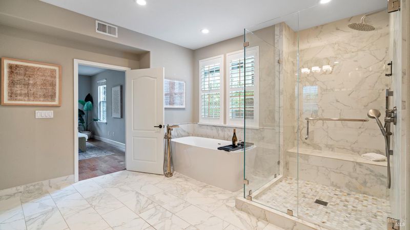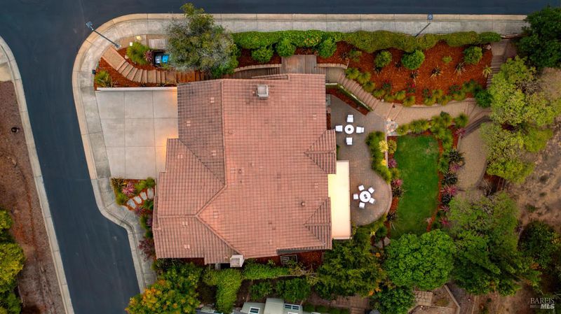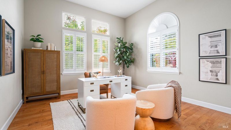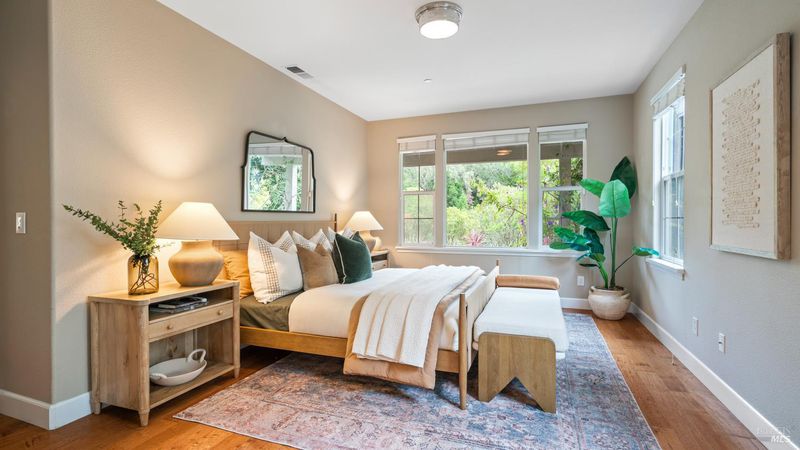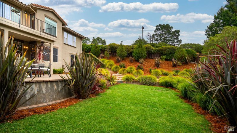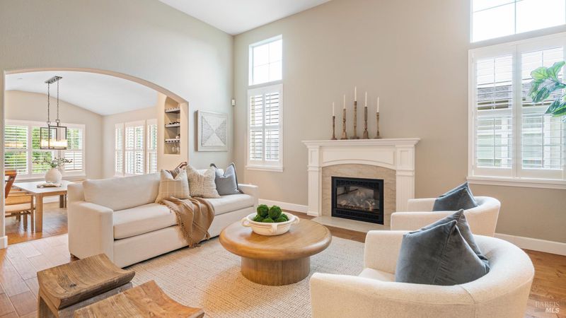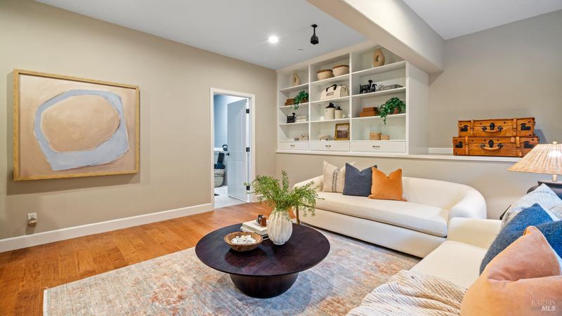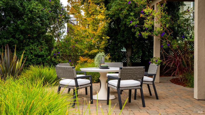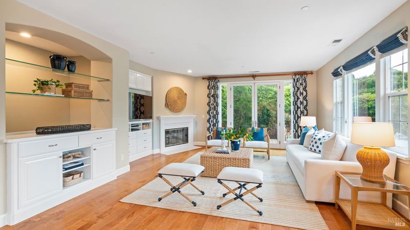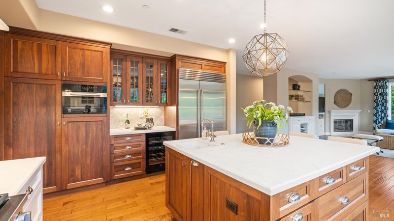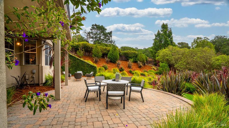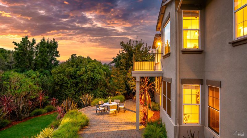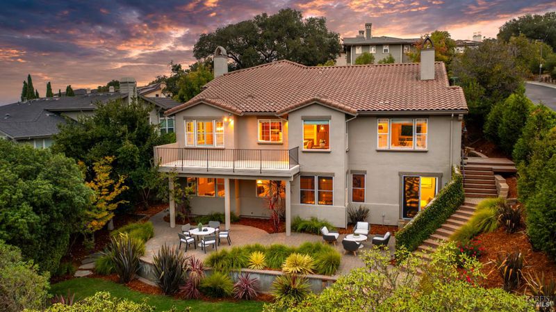 This Country Club Estates corner home exemplifies luxurious, comfortable living. The elegant front yard features tasteful low-maintenance landscaping leading to an ornate wood door. Inside, a spacious study impresses with tall ceilings and windows, glass French doors, and ceiling fan. Descend to the living room with a gas fireplace or continue to the dining area with chandelier and scenic views. The bright chef's kitchen offers quartz counters, a large sink island, Miele appliances including two dishwashers and a wine fridge, and soft-close cabinets. The open family room includes a gas fireplace, built-in shelves, backyard access, and a dining nook. This level also holds a deck, full bath, 3-car garage, and great storage. Downstairs are three guest rooms (one with backyard door), a full bath, laundry room, and luxurious primary suite with a soaking tub, spacious shower, illuminated double vanity, and expansive walk-in closet system. The lower area includes a family room with Bose speakers and a tiled room perfect for a personal gym. The backyard is quiet, private, and lush with brick patio, private walkway to the jetted hot tub, and hillside landscaping all backing to peaceful nature. All of this with included A/C and smart thermostats, you won't find more peak Petaluma living!