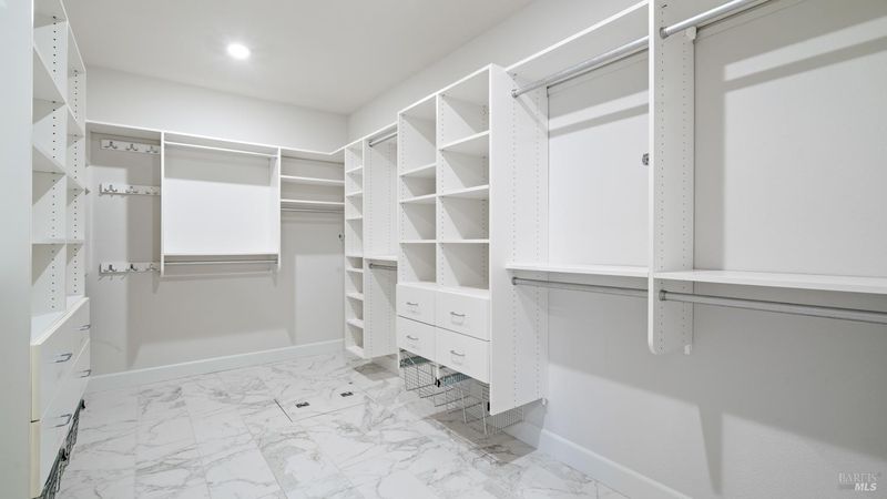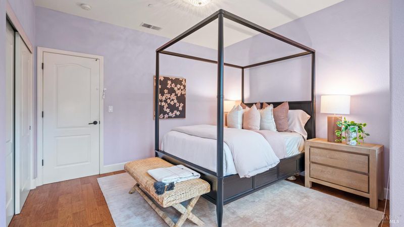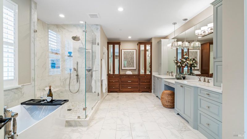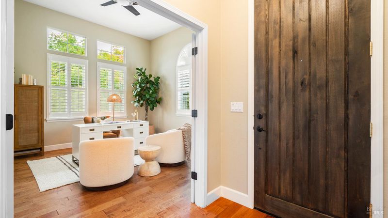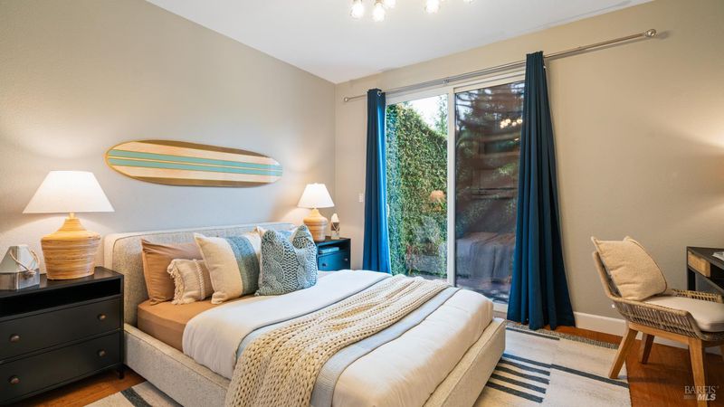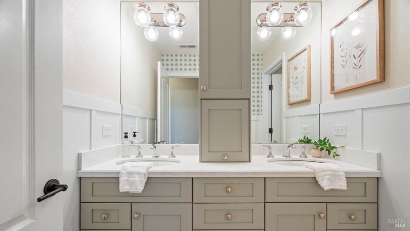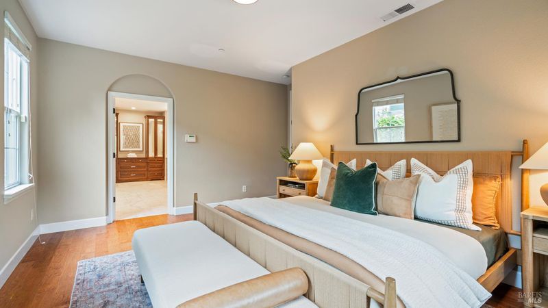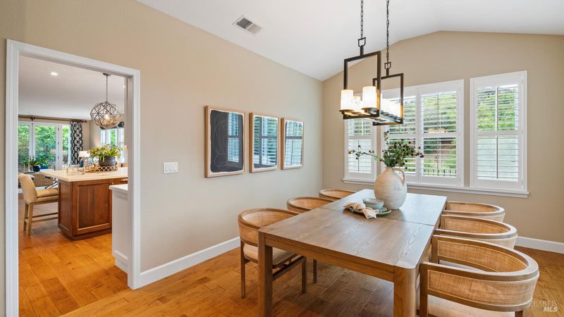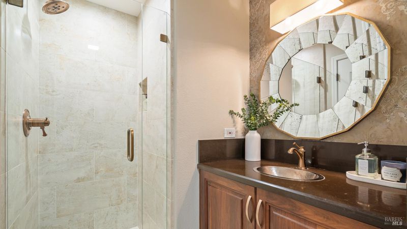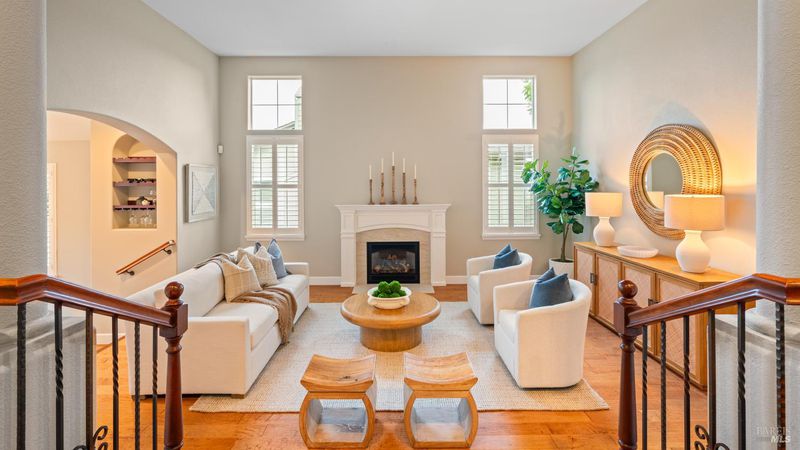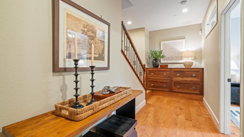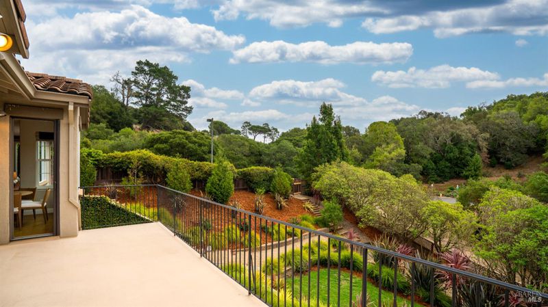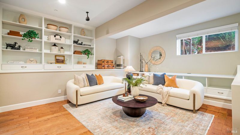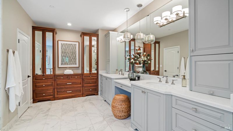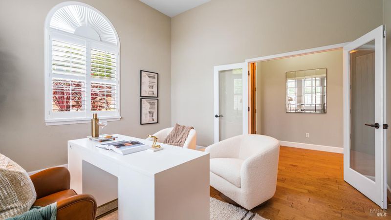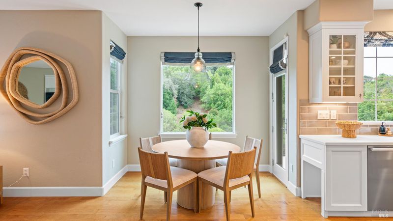 This Country Club Estates corner home exemplifies luxurious, comfortable living. The elegant front yard features tasteful low-maintenance landscaping leading to an ornate wood door. Inside, a spacious study impresses with tall ceilings and windows, glass French doors, and ceiling fan. Descend to the living room with a gas fireplace or continue to the dining area with chandelier and scenic views. The bright chef's kitchen offers quartz counters, a large sink island, Miele appliances including two dishwashers and a wine fridge, and soft-close cabinets. The open family room includes a gas fireplace, built-in shelves, backyard access, and a dining nook. This level also holds a deck, full bath, 3-car garage, and great storage. Downstairs are three guest rooms (one with backyard door), a full bath, laundry room, and luxurious primary suite with a soaking tub, spacious shower, illuminated double vanity, and expansive walk-in closet system. The lower area includes a family room with Bose speakers and a tiled room perfect for a personal gym. The backyard is quiet, private, and lush with brick patio, private walkway to the jetted hot tub, and hillside landscaping all backing to peaceful nature. All of this with included A/C and smart thermostats, you won't find more peak Petaluma living!