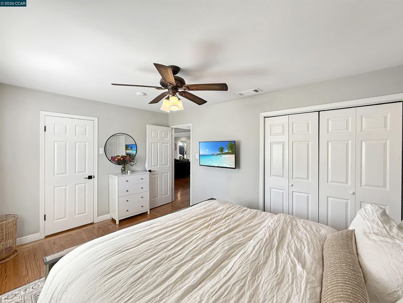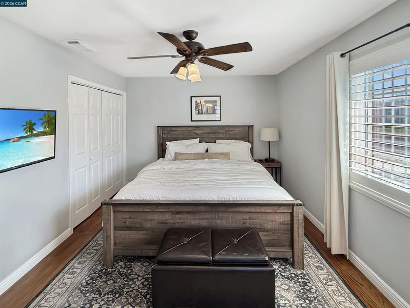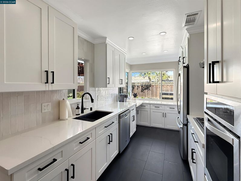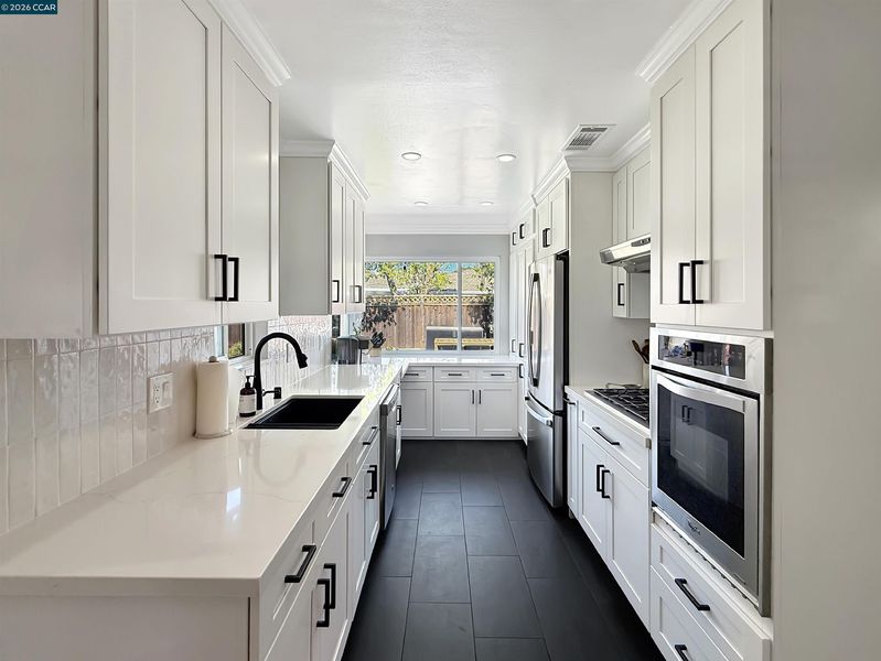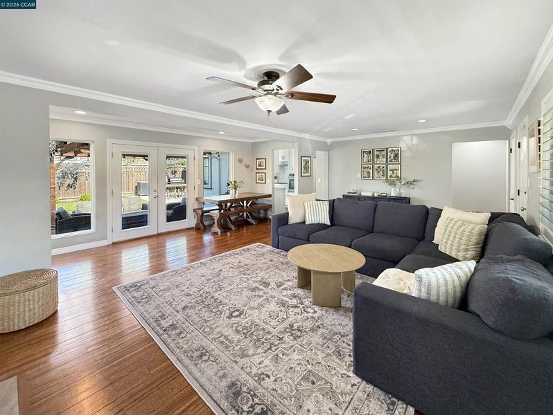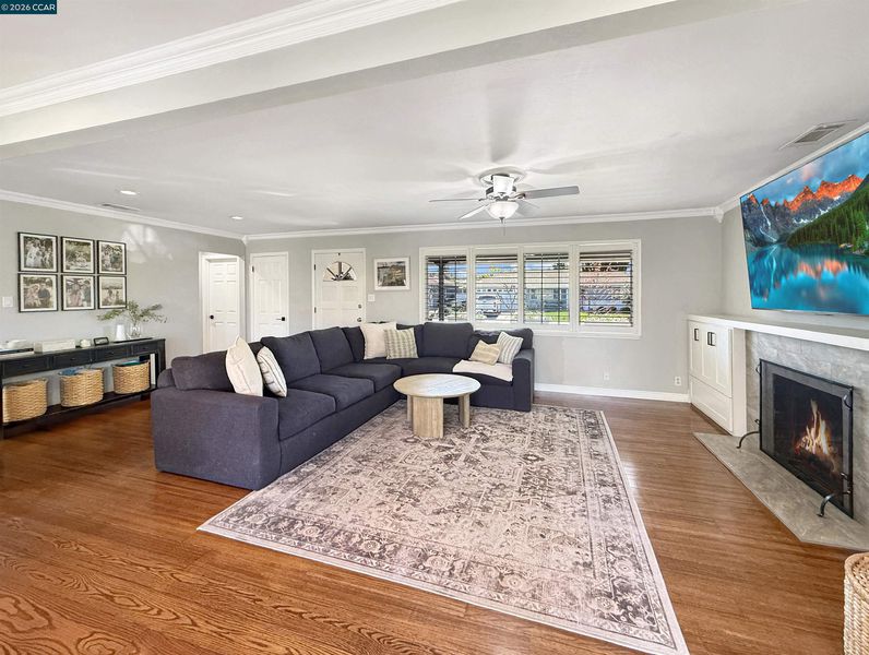 Updated single-level home in desirable Holbrook Heights. This turnkey property features refinished hardwood floors throughout, complemented by crown molding, 6-panel doors, and new matte black hardware in every room. The recently remodeled kitchen showcases quartz countertops, stainless steel appliances, and gas range, perfect for the home chef. Both bathrooms have been beautifully renovated with modern finishes. Enjoy year-round comfort with central air conditioning, updated lighting and ceiling fans throughout, and double-pane windows for energy efficiency. The living room features custom built-ins and a tiled gas-burning fireplace, while French doors open to the backyard with a covered patio and a 12x8 storage shed. Additional attic insulation enhances energy efficiency, and closet built-ins provide extra storage. Expanded driveway offers convenient parking. The Holbrook Heights HOA provides access to a community pool, playground, and clubhouse, all just a short walk away. Unbeatable location: walk to Pixieland amusement park, Willow Pass Pickleball and Tennis Courts, downtown Concord, Todos Santos Plaza, and BART. Easy access to shopping, dining, and major commute routes. Move-in ready and waiting for you. Buyers to verify square footage.