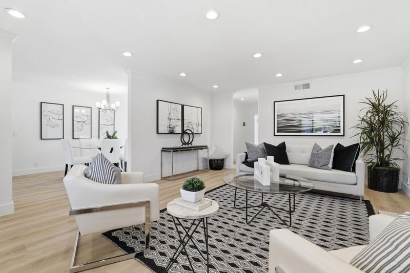 Move right into this refreshed 5 bedroom, 2.5 bathroom home offering a flexible layout for everyday living, work, and creative space. New flooring and a bright interior with recessed lighting create a welcoming feel, while the main living and dining areas flow naturally together. The kitchen features tile countertops, newly painted cabinetry and a full suite of appliances. Bedrooms include mirrored closets with built-in organizers, and the primary suite offers a private ensuite bath with a tiled stall shower. Leased solar supports energy efficiency. The dining area opens directly to an expansive deck, creating a seamless indooroutdoor connection. Brick and stepping-stone paths lead to a backyard shaded by a large oak tree, with multiple areas to relax, work, entertain, or play. A detached structure with electricity provides additional versatility for remote office, hobbies, and storage, and a whimsical play structure for the kids. A custom bar area adds a natural gathering point. The layout offers flexibility for both quiet enjoyment and larger get-togethers. Attached 2-car garage with built-ins and workshop space. Excellent commuter location near major Silicon Valley employers, shopping and dining, and quick stroll to Baker Elementary, Moreland Middle, and the Harker School.