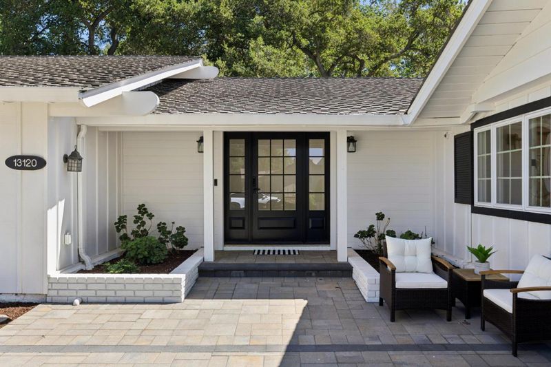 Beautifully updated single-story home in Saratoga's Golden Triangle, backing to Saratoga Creek with mature trees and a private natural setting. New paver driveway, professional landscaping, and modern Andersen front door with Yale smart lock. Inside, new entryway tile, refinished hardwood floors, new Milgard windows, new interior doors, and a coastal-inspired palette fill the home with light. New electric fireplace with shiplap surround in the formal living room. Eat-in kitchen with freshly painted cabinets and quartz countertops connects to the dining room and great room. Exposed beam ceilings, a second new fireplace, and new carpet complete the flow. New recessed lighting throughout. Primary suite with dual closets, quartz dual-sink vanity, tiled shower with glass enclosure, and Andersen slider to the backyard. Hall bath updated with dual-sink vanity and tiled shower over tub. Private guest suite and three additional bedrooms. Out back, a large travertine patio, Caldera Spas hot tub, and fountain. Roof replaced 2018 with 50-year transferable warranty (42 years remaining). New LG appliances, dual-zone HVAC, 200A panel, 220V/50A EV circuit. Congress Springs Park three blocks away. Award-winning Argonaut, Redwood, and Saratoga High all minutes away.