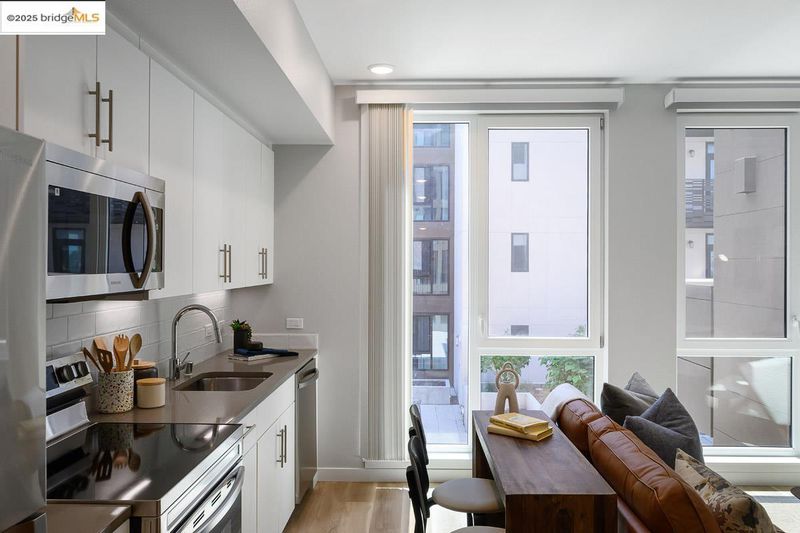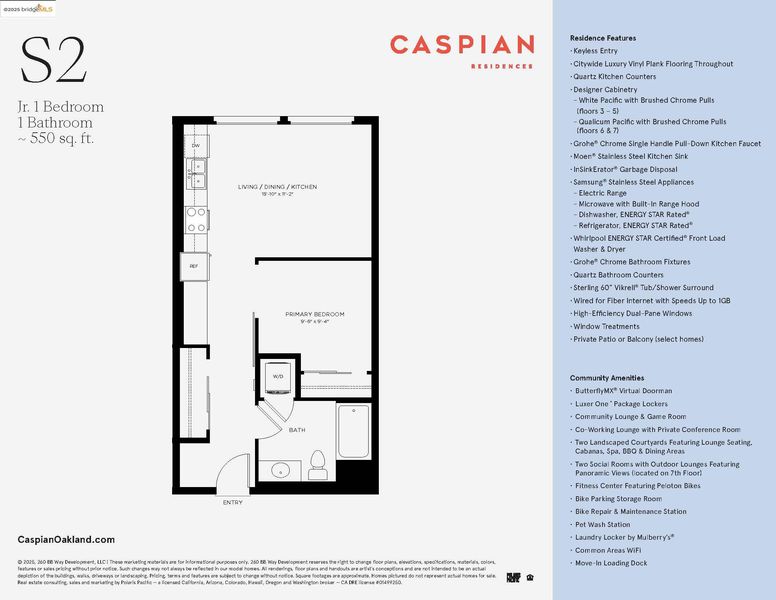 Now Selling at Caspian Brooklyn Basin. Discover modern waterside living in this thoughtfully designed JR 1-bedroom with a separate sleeping room, slider, and closet, 1-bathroom condo, spanning approximately 550 sq ft. Located in one of Oakland’s most exciting new communities, this home offers a rare chance to own in a vibrant, amenity-rich setting. The open layout features sleek finishes, a well-equipped kitchen with Samsung stainless steel appliances, quartz countertops, and modern cabinetry. High-efficiency dual-pane windows frame the bright living area, while the bathroom includes quartz counters and Grohe fixtures. Includes in-unit washer and dryer. Caspian residents enjoy a fitness center, a dedicated co-working space, landscaped courtyards, a game room, and rooftop lounges with panoramic views. Situated on Oakland’s revitalized waterfront at Brooklyn Basin, the community provides direct access to parks, dining, and recreation, with Jack London Square, BART, and ferry service to San Francisco just minutes away. Includes one parking space. All images are representative of the development and may be of a similar unit.